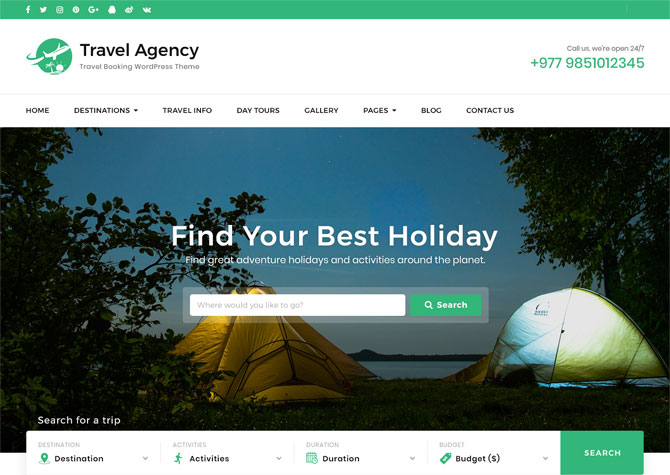 Travel Agency Pro is a premium WordPress theme to create travel booking website for tour and travel companies. You can add trips, destinations, and trip types, feature travel activities, highlight your specialties, and allow visitors to book the trips.