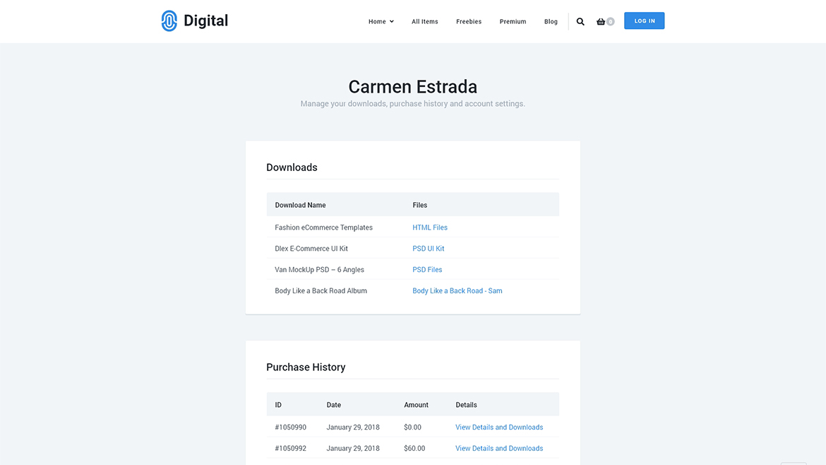 Digital Download Pro comes with a built-in Customer Dashboard template which allows the customers to check their downloads, purchase history, and account information easily. You need to create Customer Dashboard after installing the theme.