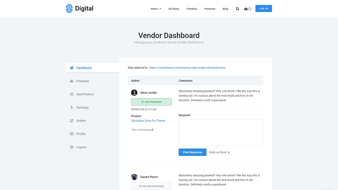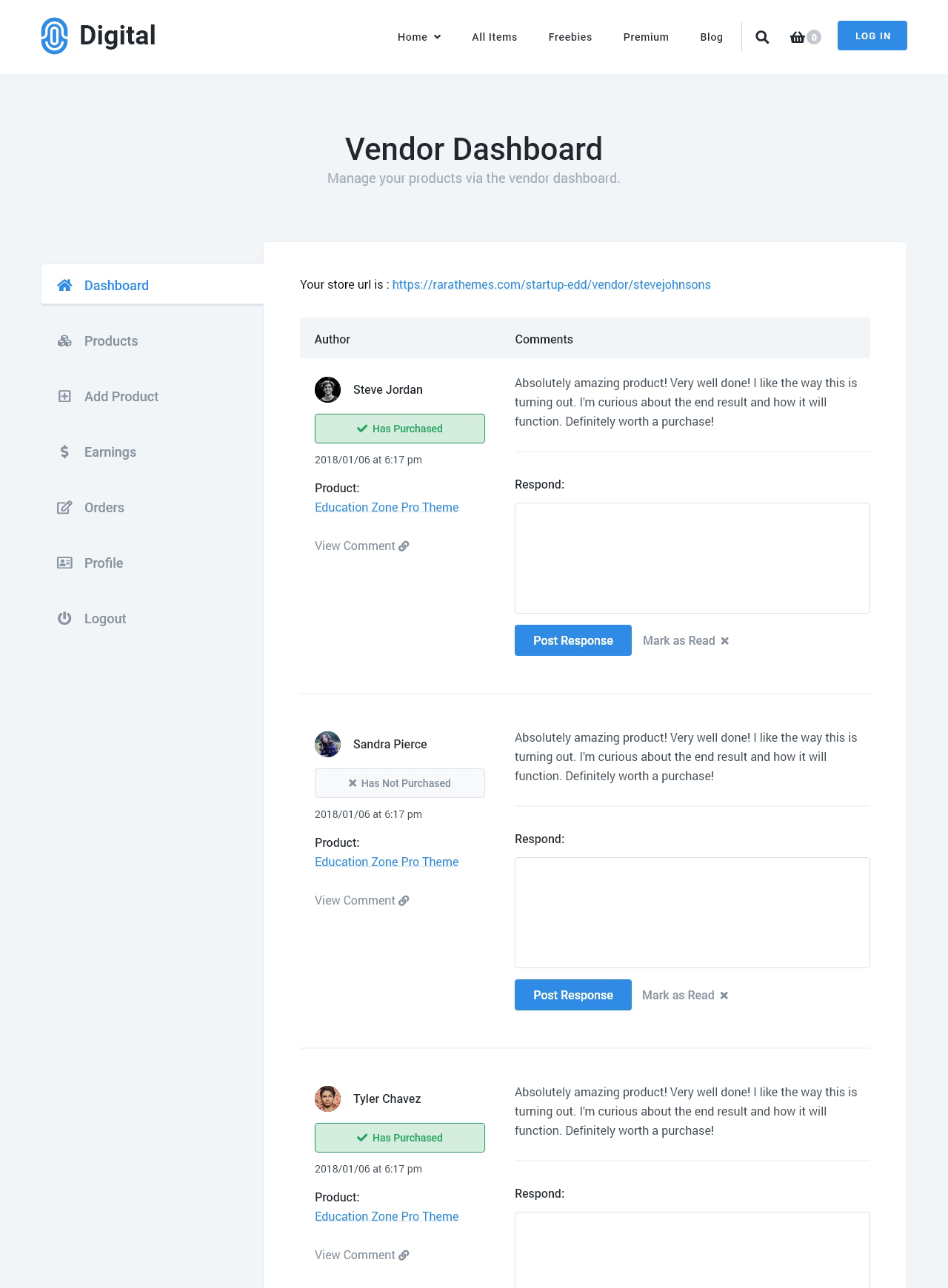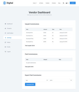 Digital Download Pro allows you to create a multi-vendor online shop with multiple-authors. You can enable the users to sell their products on your website using Front End Submissions Extension for Easy Digital Downloads. Once the extension is installed and activated, it creates a Vendor Dashboard which allows other vendors to create and manage their products, manage the reviews and comments, view the reports of sales and more. The attractive UI with advanced features of the admin area allows helps your focus on your products and reports in a better way.